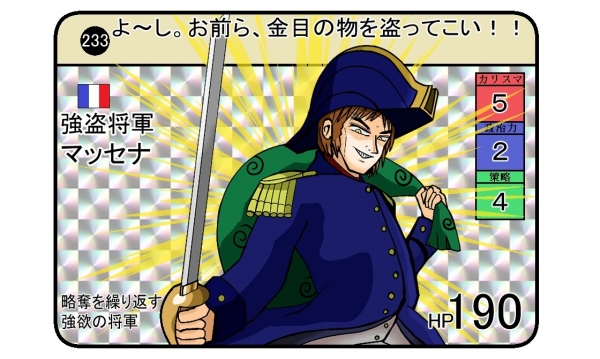 フランス革命戦争、ナポレオン戦争期に活躍した強盗。 マッセナがいなかった場合、第二次対仏大同盟の時点でフランスが負けていた可能性がある。 歴史の流れ的にも重要。 Tag: 世界史歴史カードダス風フランス革命ナポレオン戦争twitter