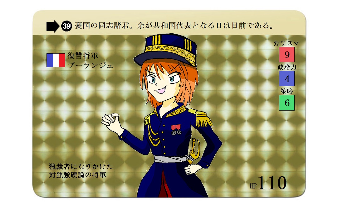 フランス第三共和政解体の危機となるクーデター未遂事件を起こした人物。 本気で独裁者を目指していたのかは不明。周りに担ぎ上げられていただけの可能性もある。 Tag: カードダス風普仏戦争第三共和政フランス世界史twitter