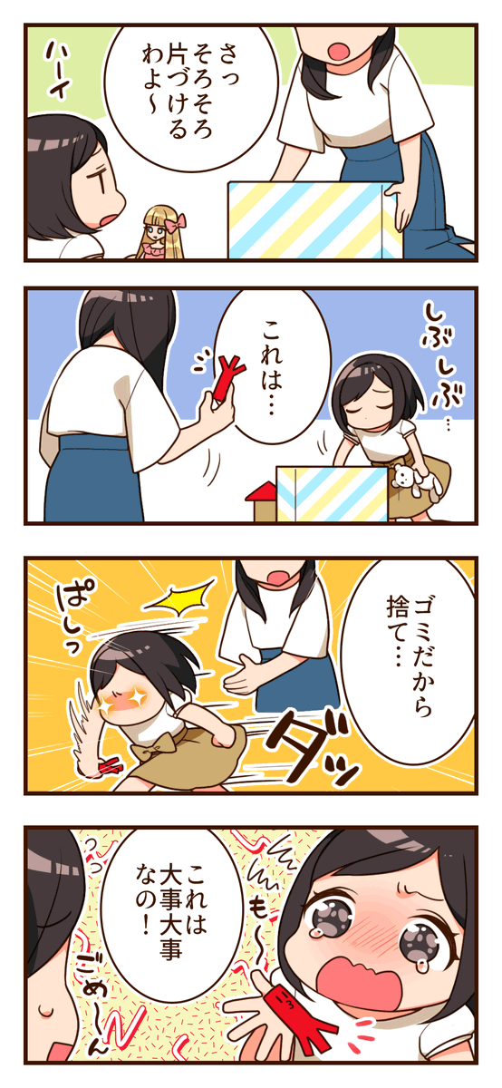 物作りが好きな娘さんの作品の処分に困ることがあります(苦笑) 打ち捨てられているのを見ると、もう流石にいらないだろう・・・と思うのですが、ちゃんと聞かないで捨てると怒られます(-ω-; 大人にとってはゴミでも、娘さんにとっては大事なもの。 そのこだわり、なんとなく身に覚えがありますよね(*^^*) 标签: はなまるFX4コマ漫画4コマオリジナル女の子子供日常絵日記twitter